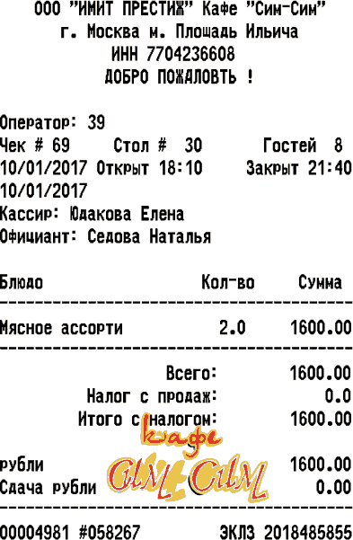 Изготовление и восстановление чеков ресторанов или кафе осуществляется на современной технике. Что позволяет сохранить визуальную схожесть чеков с оригинальными.